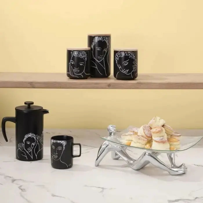 The CANISTER SMALL SET OF 3 Sketchbook Black Mix provides a sleek and elegant way to store kitchen essentials. Made of porcelain with a satin finish, the set includes three canisters with rubberwood lids. A stylish and functional addition to any modern kitchen.