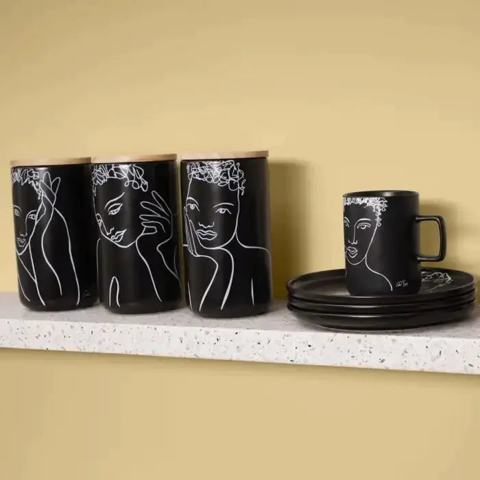Keep your kitchen organized in style with this Sketchbook Black Large Canister. Its designer sketch, 'reminisce,' adds a touch of sophistication while keeping your dry ingredients and kitchen essentials fresh and easily accessible. Elevate your kitchen decor with this effortless yet elegant addition.